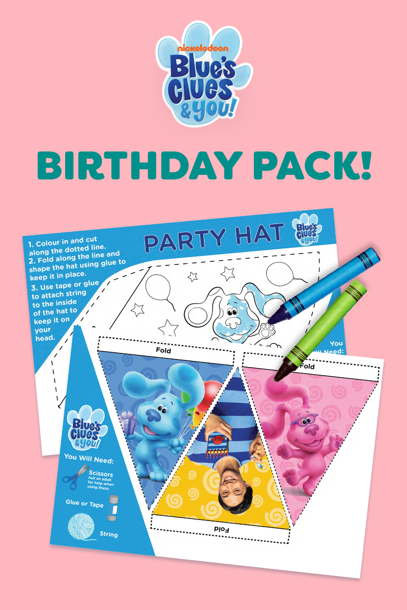 Celebrate Blue’s birthday! Puppies of all sizes can print this party pack in order to put together a fun birthday banner, color in a birthday card, and fashion a party hat. The only thing left to do is eat cake. (Pretty please?!)