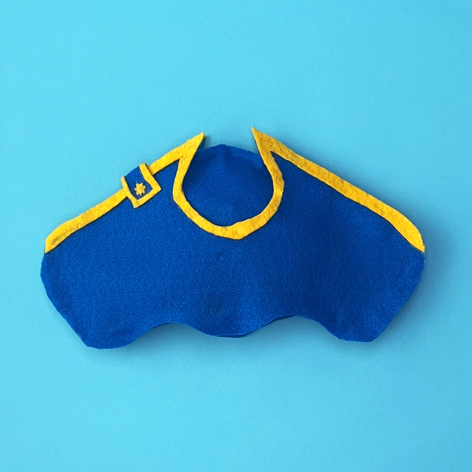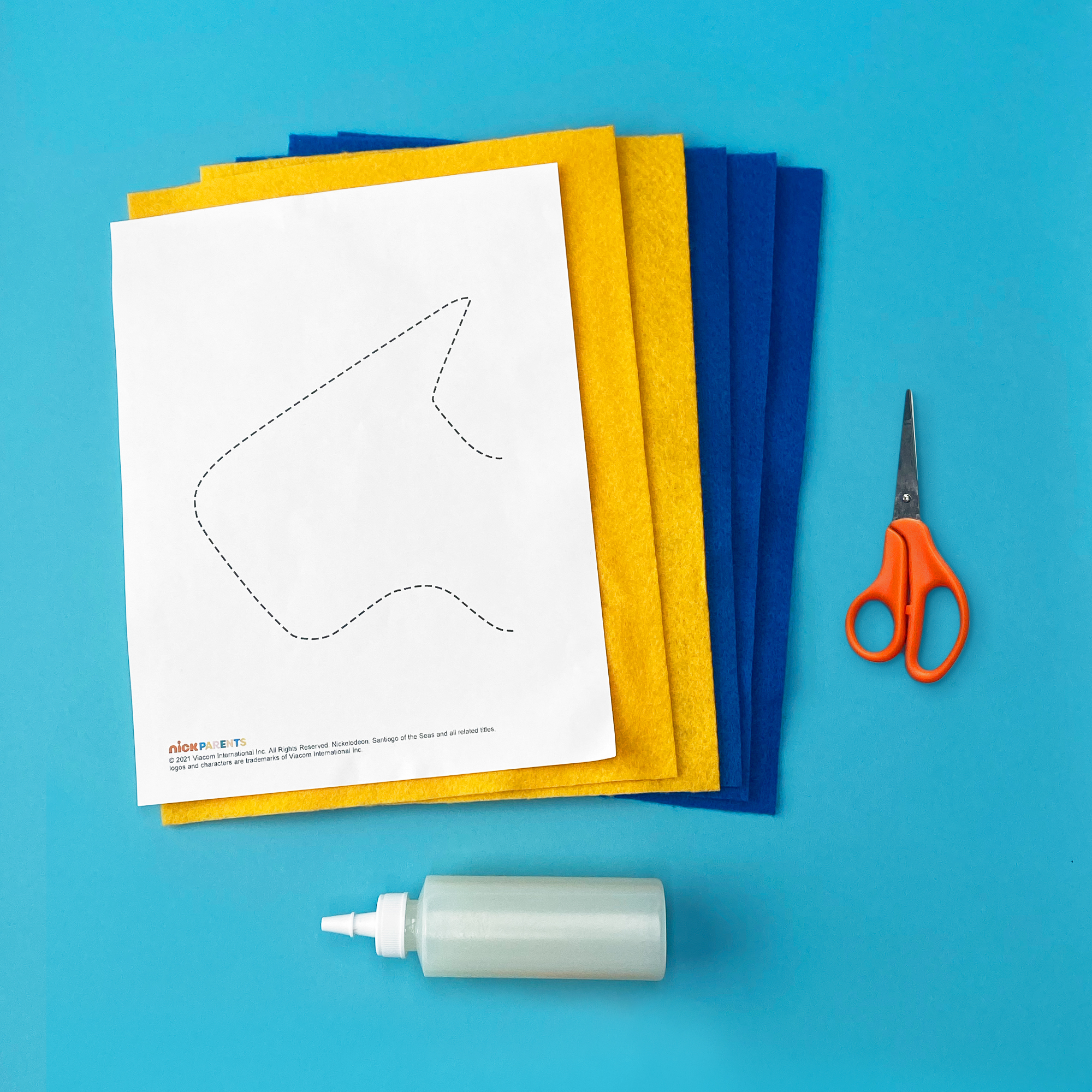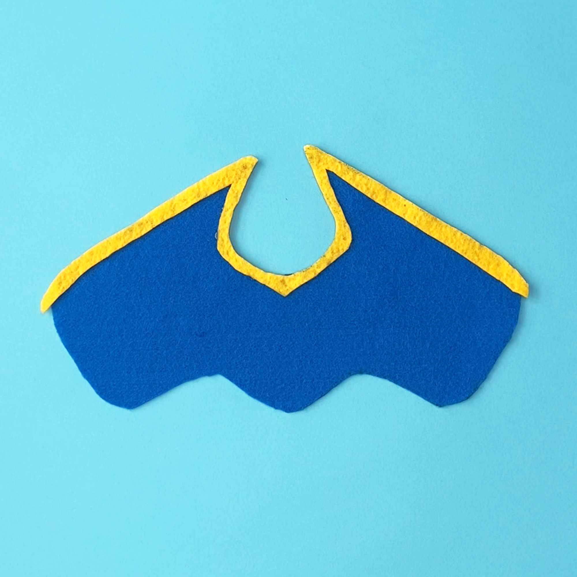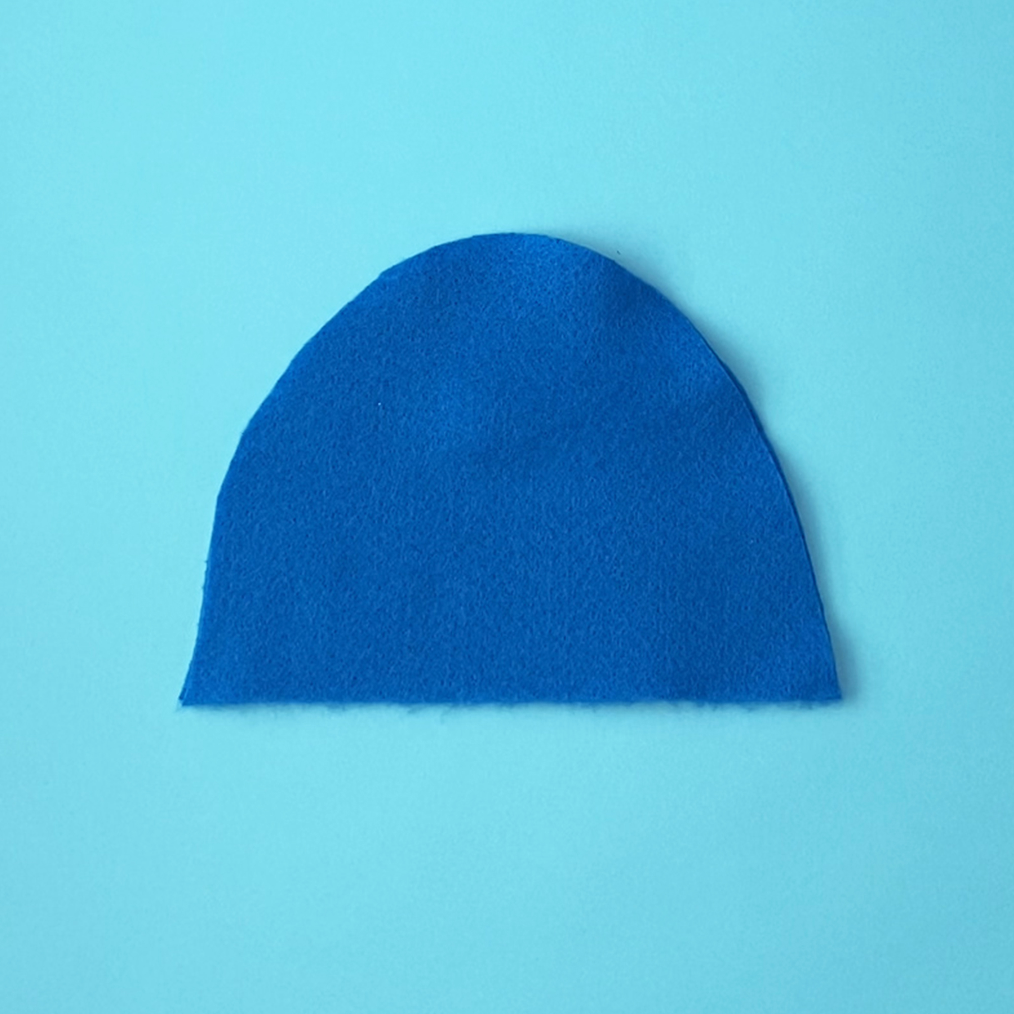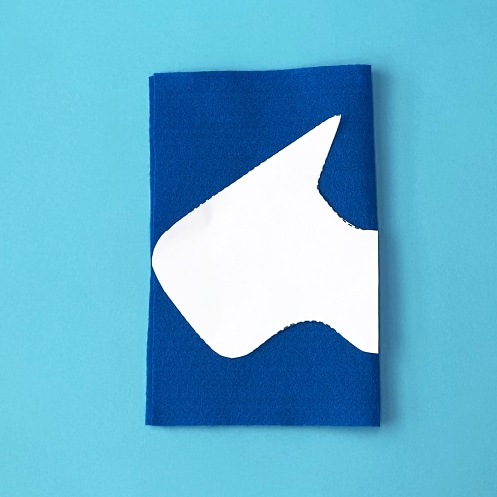 Step 2: Fold a piece of blue felt in half. Line up the flat end of the stencil to the folded edge of the felt and then trace and cut the blue felt piece. Repeat with another piece of blue felt and again with two pieces of yellow felt.