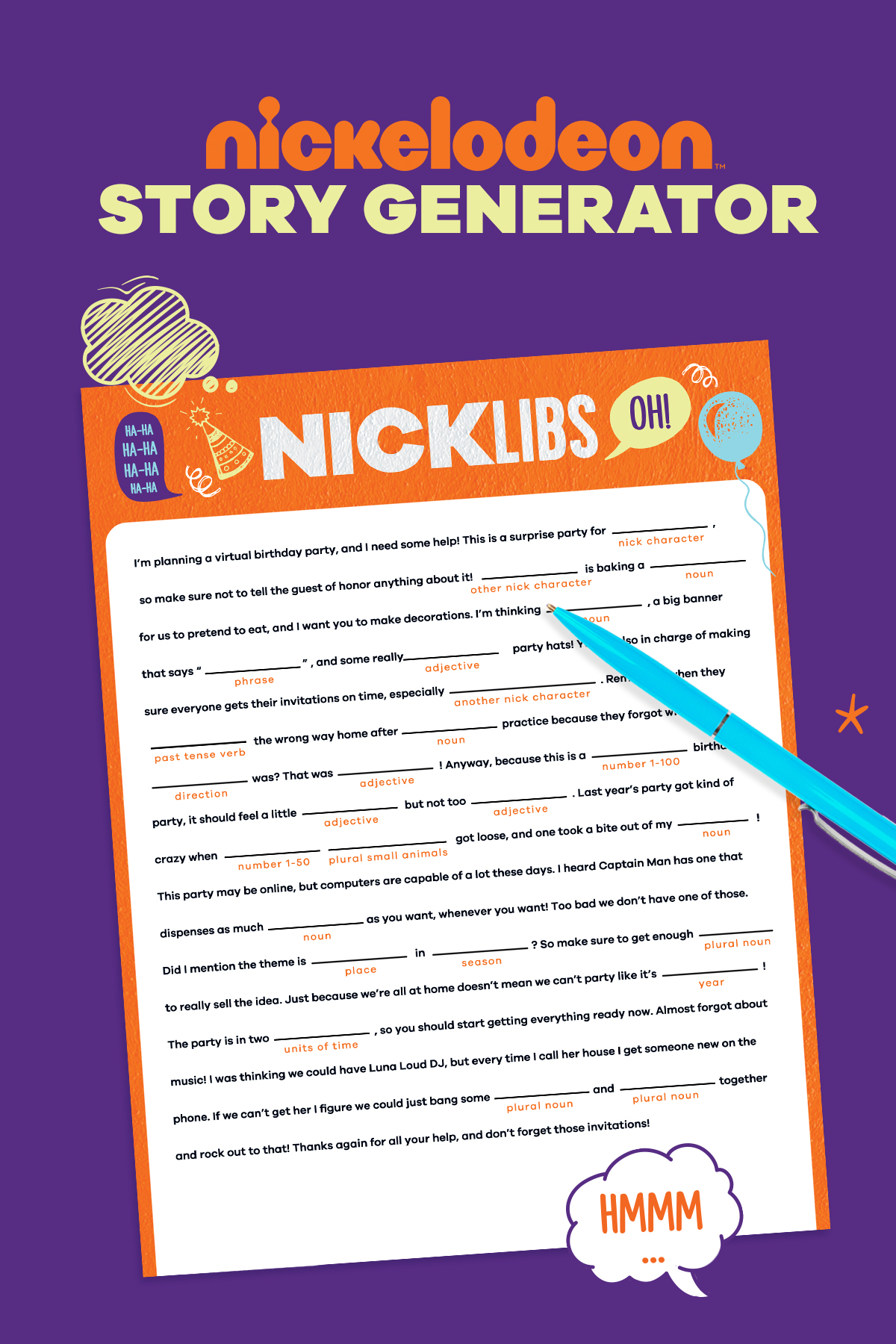 Get out your pens, your printers. Practice your nouns, verbs, adjectives, synonyms, and Nick character names. Then, get creative, wacky, outrageous, wild (see what we did there?) and read aloud for some laughs.