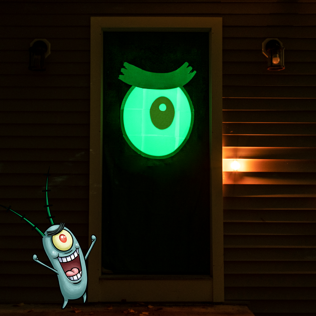 Step 5: Put a plastic colored table cloth onto your door and glue or tape the cut out of Plankton’s eye.