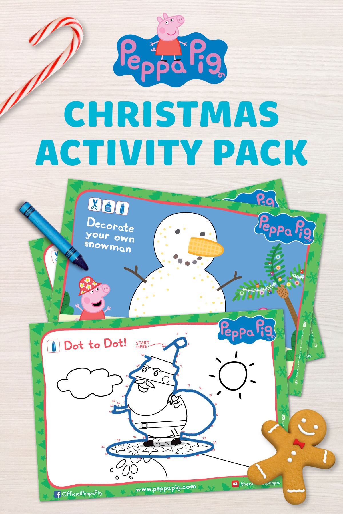 Peppa can’t wait to celebrate. Cheerio and let’s get right to printing out this activity pack so that Peppa’s people can color and make a greeting card, decorate a snowman, spot the differences, connect the dots, cut out a piglet puzzle, and draw a very festive snow globe.