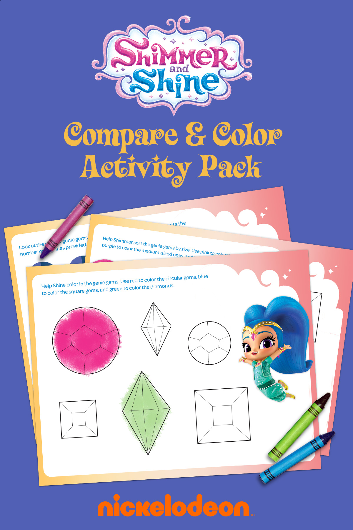 Home / Indoor Activities Shimmer and Shine Compare & Color Activity Pack Color and count the genie gems. By Nickelodeon Staff Share Shimmer and Shine need your preschooler’s help to color, sort, and count all their genie gems. Boom Zahramay! Print Now Tags: Shimmer and Shine, Indoor Activities, Preschool Printables, Printables, STEM, Educational, Indoor Activities, printables, shimmer and shine, STEM
